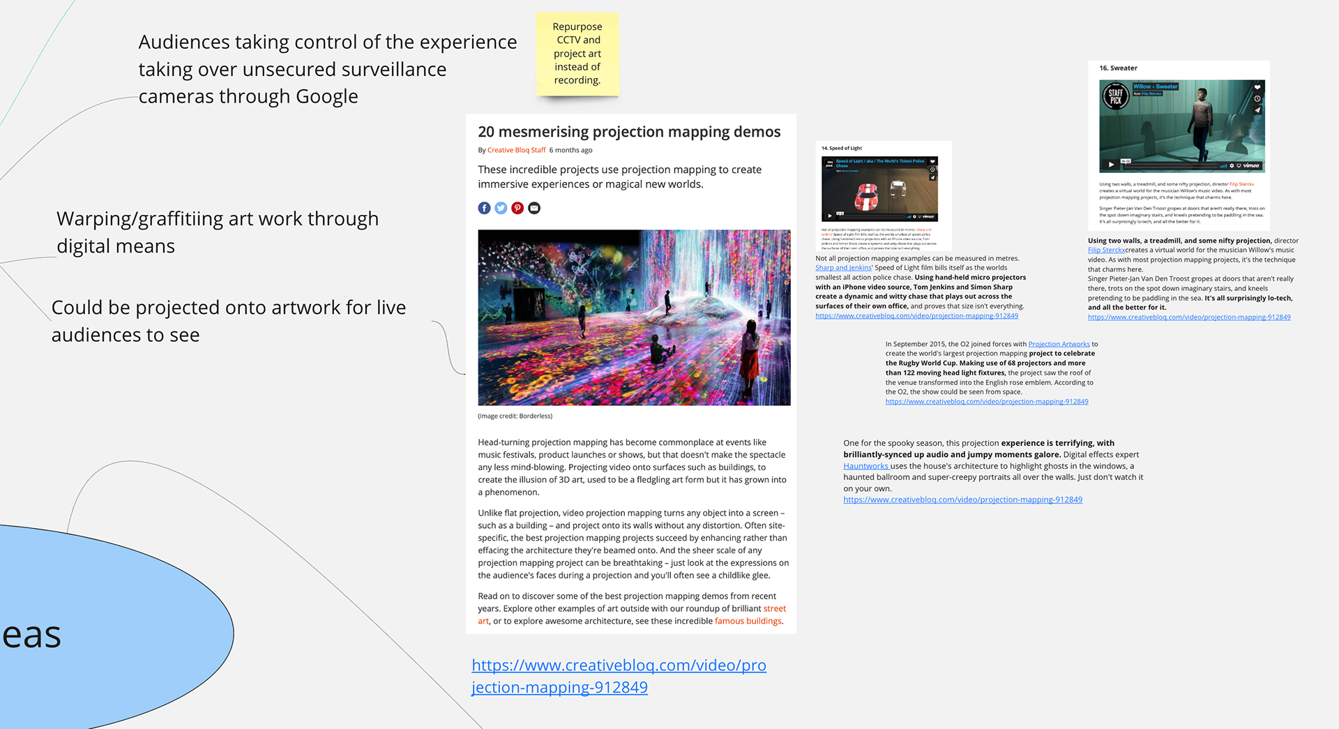 Interestingly there are lots of examples where art has been applied to things other than the canvas. Here are a few of the more interesting areas on our Miro that might help us with prototype ideas. The technologies big and small and what has already been done will help inform our direction. most digital art relies on either projection or immersion. I find having visuals around the spaghetti monster a little more helpful because I can see the tangle concepts rather than just worded ideas.